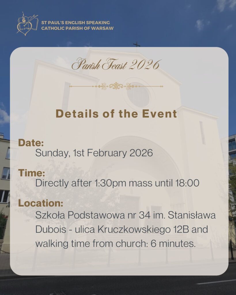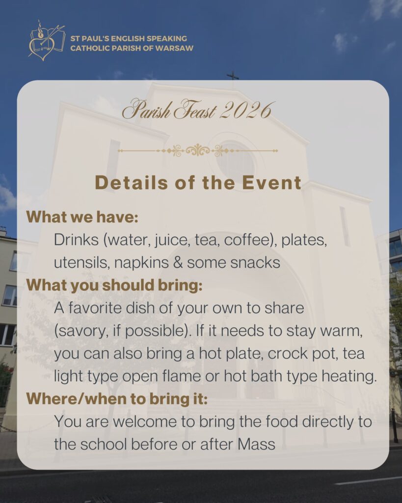 Join St Paul’s English Speaking Catholic Parish of Warsaw for a free Parish Feast potluck lunch on 1 February 2026 after the 1:30 PM Mass. Here’s the schedule, location, and what to bring.
